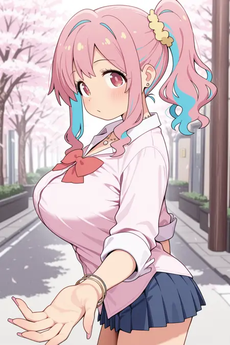 hozuki kaede, ピンクの目, ピンクの髪, サイドポニーテール, ストライプ髪, サイドロックス, ピアス