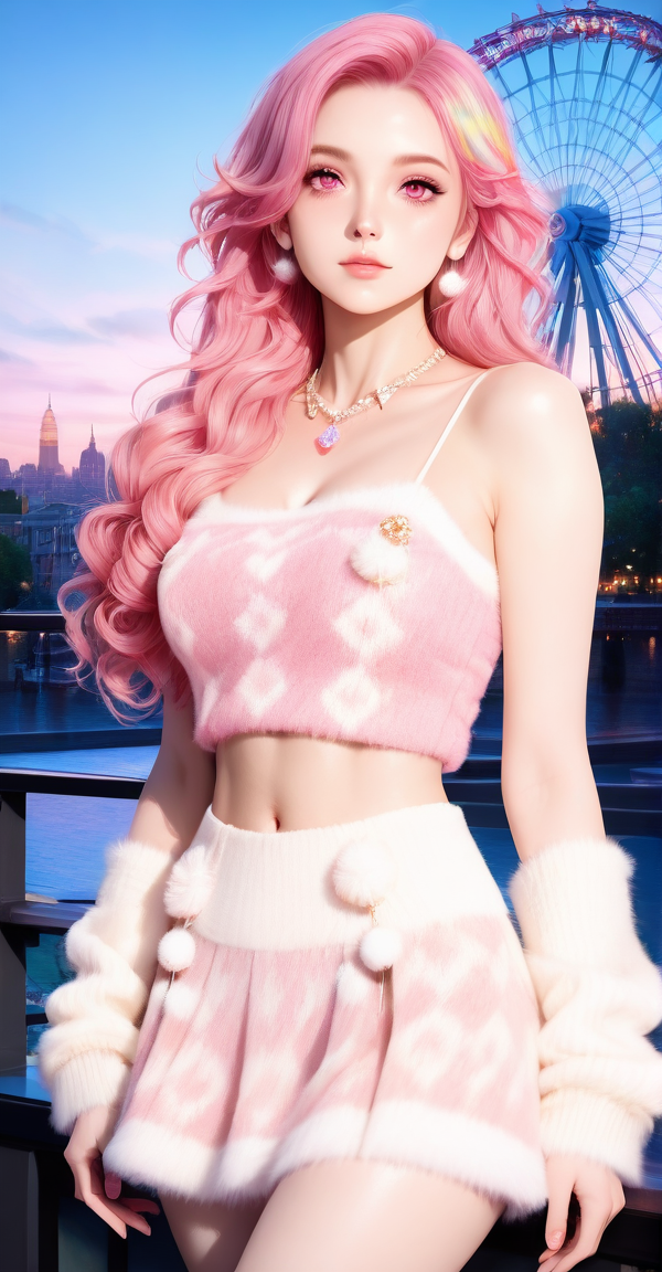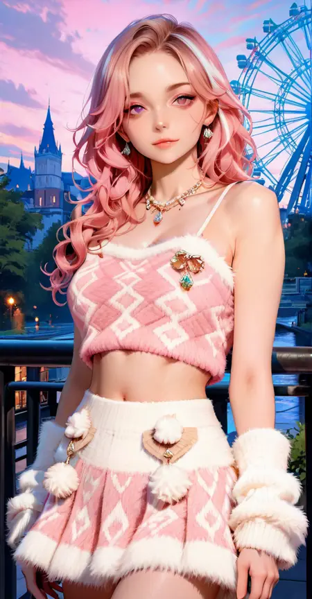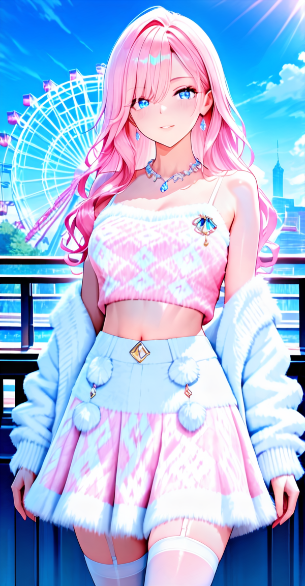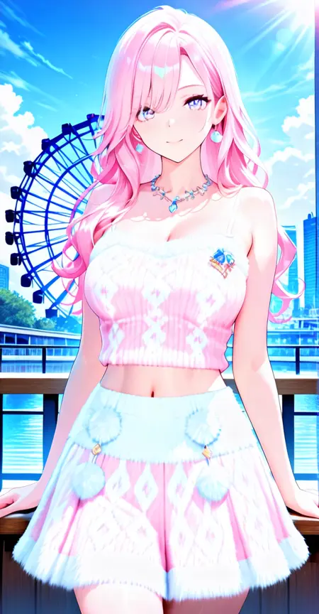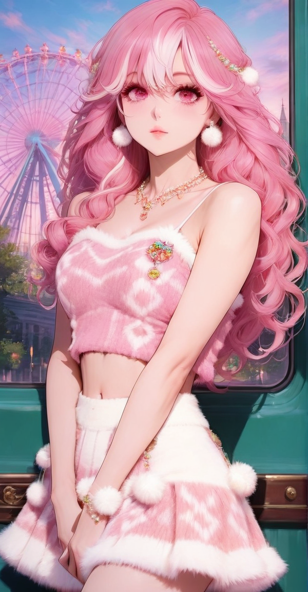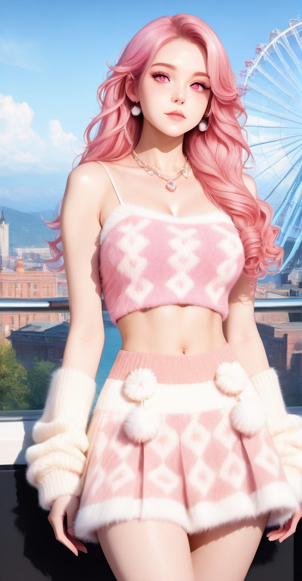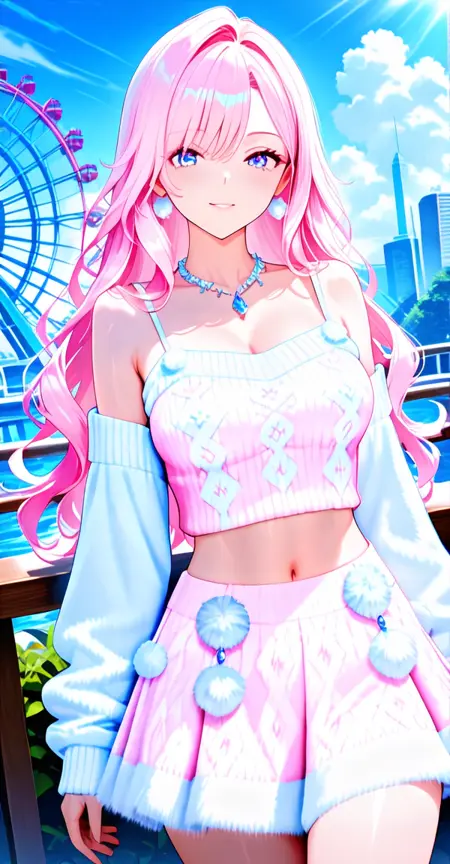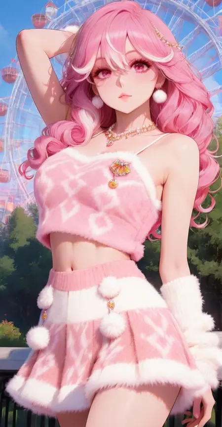 camisole, sweater vest, xg1, jewelry, necklace, pom pom \\(clothes\\), midriff, navel