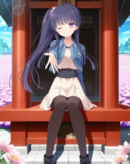 Hananono_Kasasagi, purple hair, long hair, side ponytail, purple eyes,blue jacket, dress, black pantyhose, black shoes,