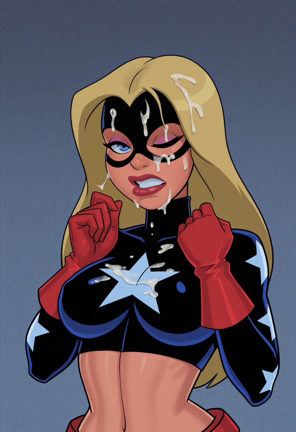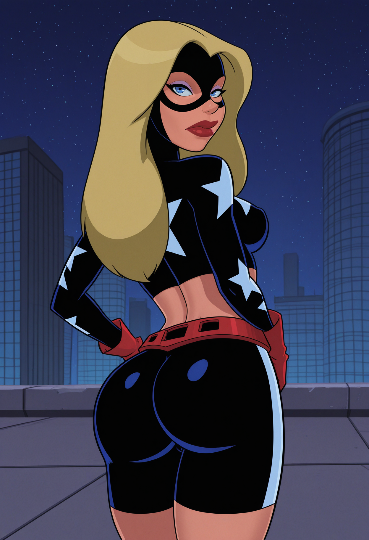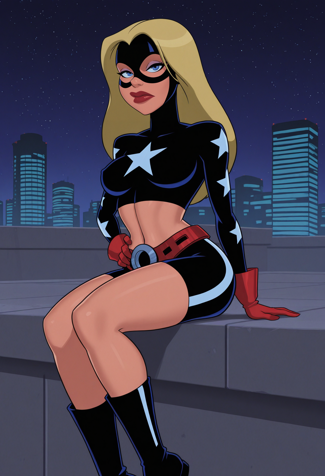 Stargirl, superhero, mask, domino mask, bodysuit, spandex, skin tight, crop top, star (symbol), midriff, navel, gloves, belt, shorts, bike shorts, boots, black footwear,