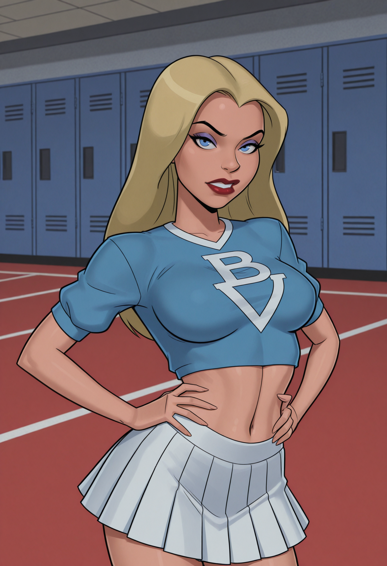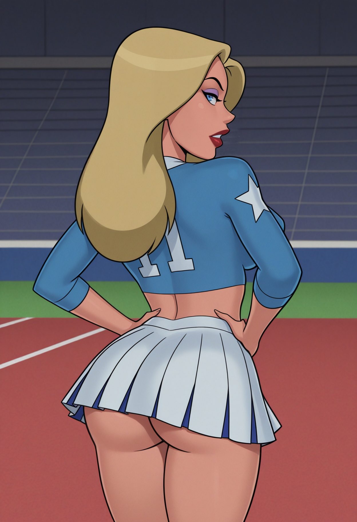 cheerleader_star_outfit, crop top, shirt, blue shirt, skirt, pleated skirt, white skirt, miniskirt,