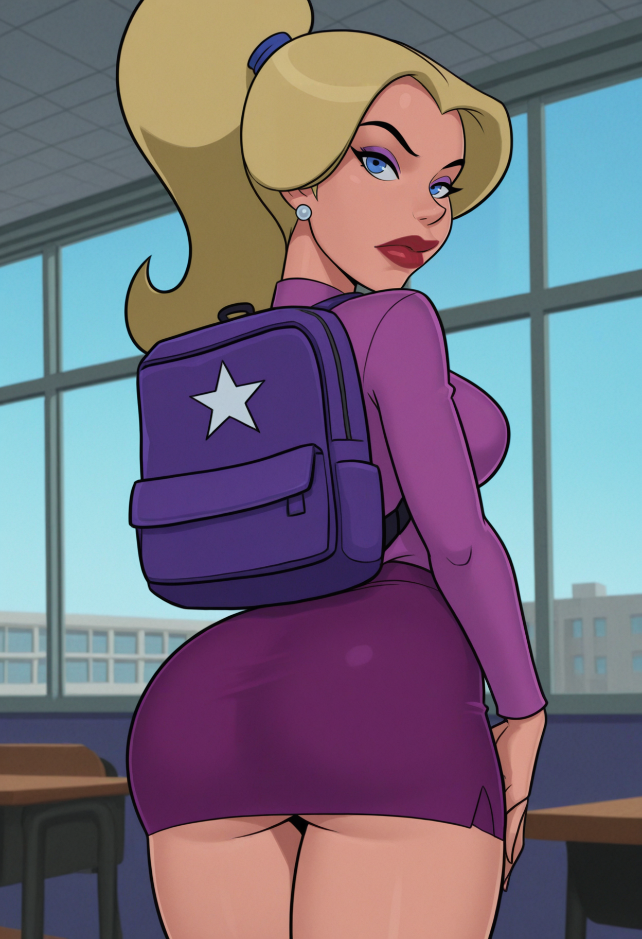 home_star_outfit, jewelry, earrings, collarbone, shirt, purple shirt, long sleeves, navel, skirt, pencil skirt, purple skirt, miniskirt, bag, backpack, blue backpack, thighs,
