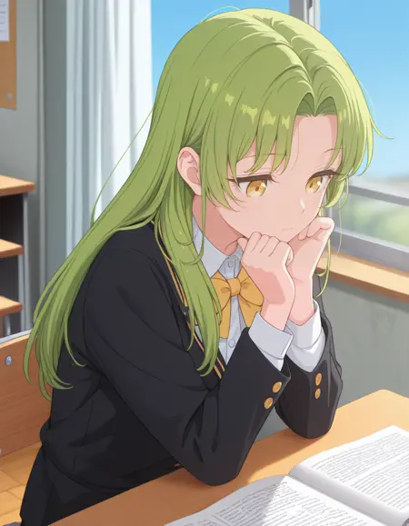 <lora:diana-saihito_s1-ixl-anime-soralz:1>, diana (saihito), 长发, 绿发, 遮帘式长发, 黄眼睛