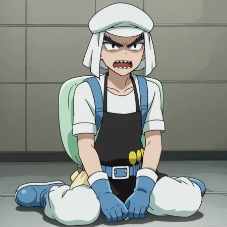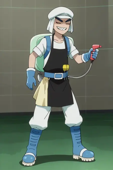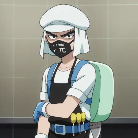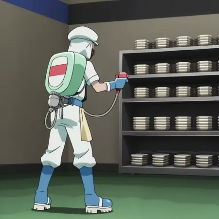프롬프트: 남성, 흰색 머리 장비, 검은 눈, 두꺼운 눈썹, 입 마스크, 흰색 셔츠, 짧은 소매, 앞치마, 장갑, 백팩, 유틸리티 벨트, 흰색 바지, 고무 부츠, 실내(주방/재고된 선반/기계/환기구/홀로그래픽 인터페이스), 실내(비밀 기지/게이트)