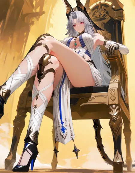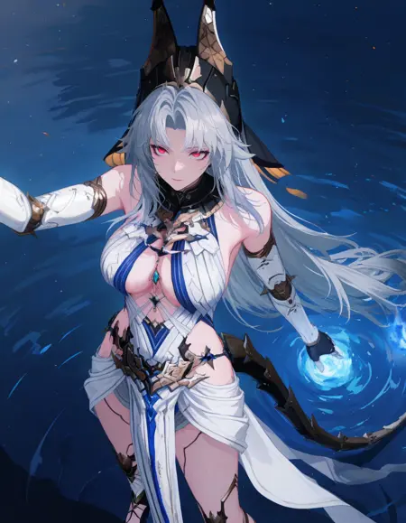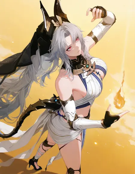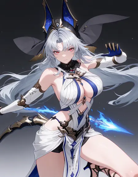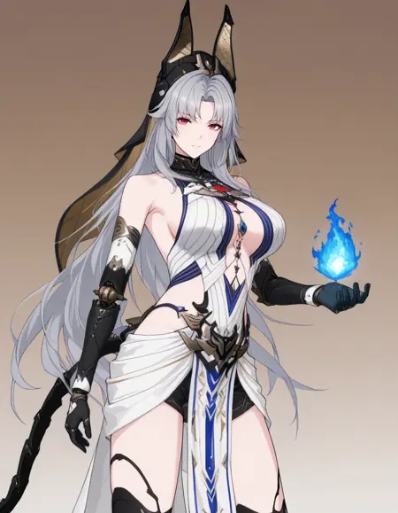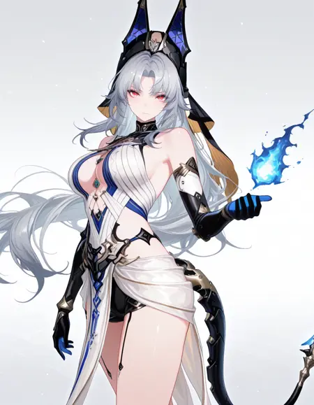 mai_pgr_veronicazg_mssj,very_long_hair,parted_bangs,grey_hair,red_eyes,large_breasts,mechanical_tail,animal_ear_headwear,white_dress,bare_shoulders,pelvic_curtain,elbow_gloves,high_heels,black_footwear,mechanical_parts,blue_fire