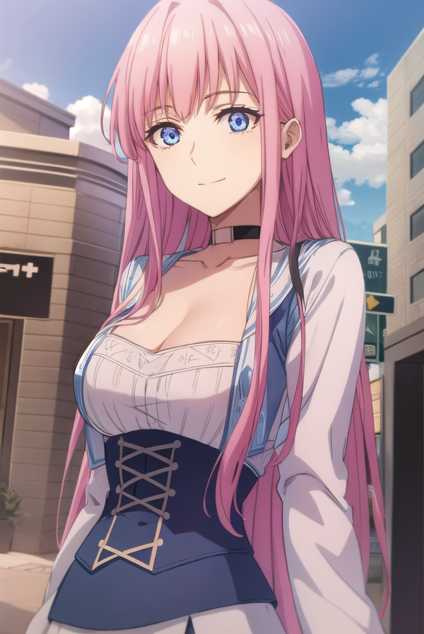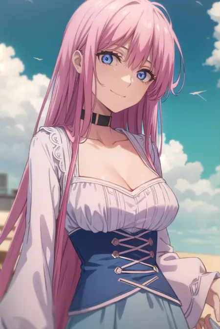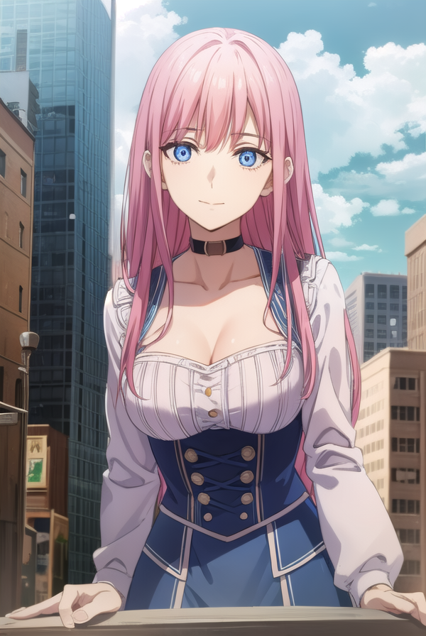 露胸,项圈,连衣裙,白色连衣裙,长袖,锁骨,紧身胸衣,蓝色紧身胸衣,裙子,蓝色裙子,