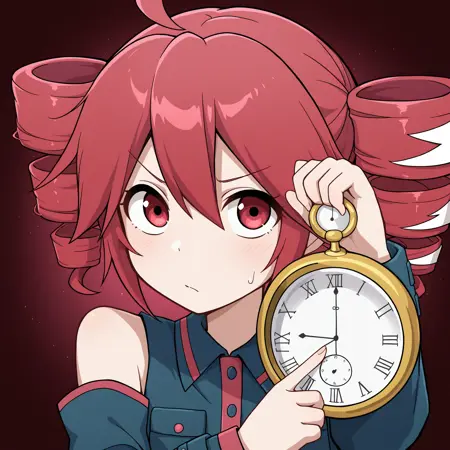 r4bbitpoints, looking at viewer, looking up, holding, pocket watch, clock, holding clock, pointing, poiniting at clock, arm up, red background,