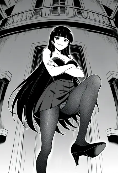 long_hair, breasts, bangs, skirt, large_breasts, cleavage, very_long_hair, pantyhose, stockings, fishnets, high heels, black hair, hime cut, monochrome, greyscale,