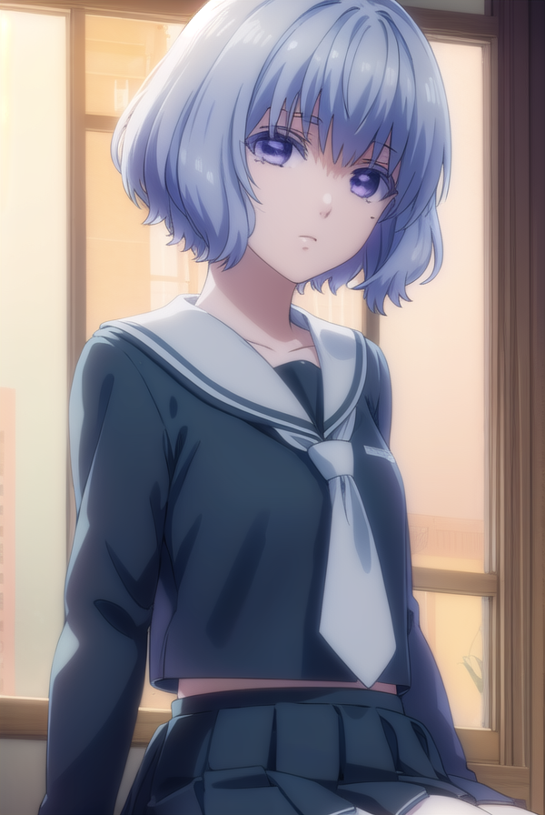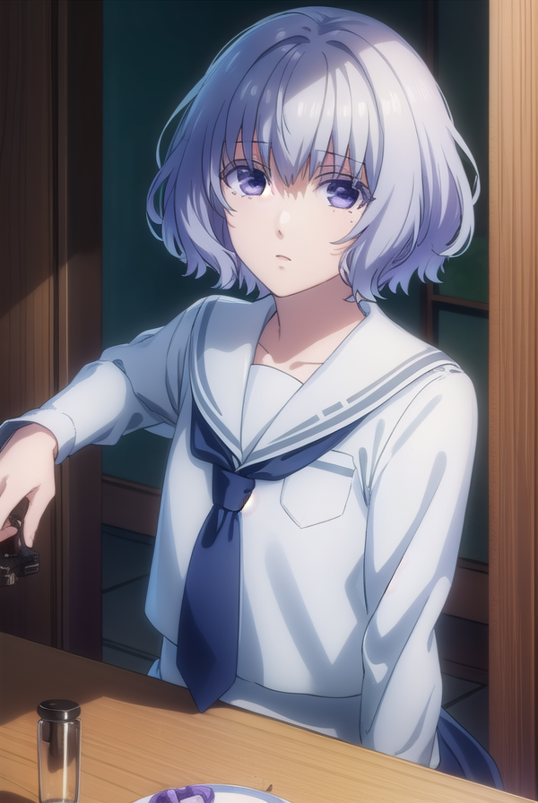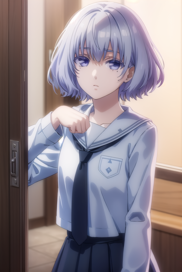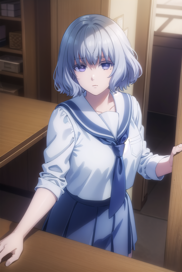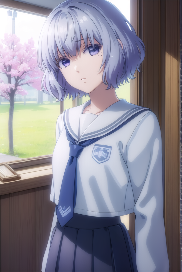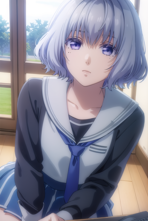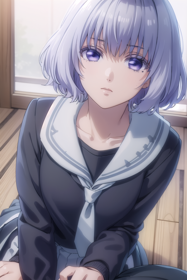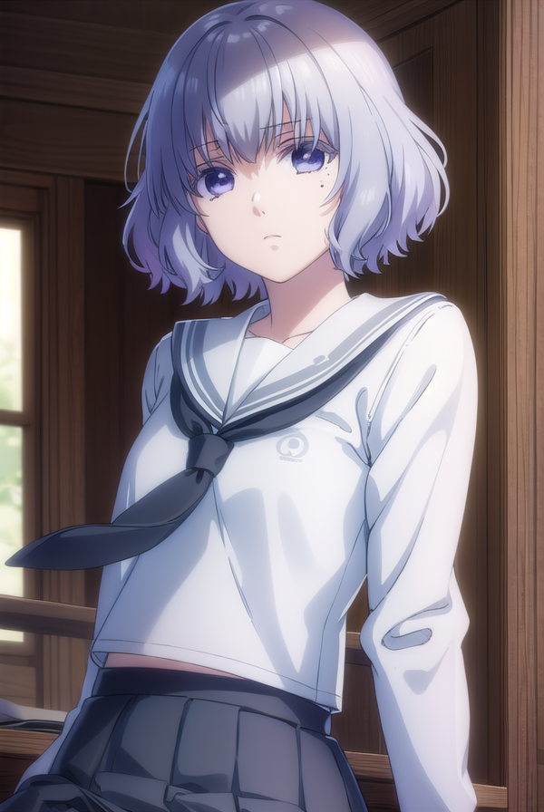 나나미 시라누이, 단발, 앞머리, (보라색 눈:1.1), 회색 머리, 두더지, 눈 밑 두더지,