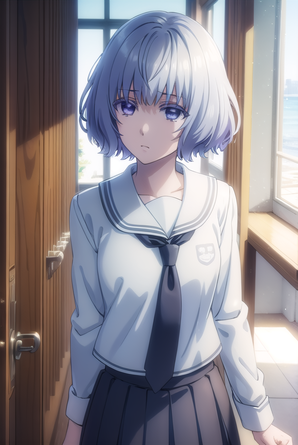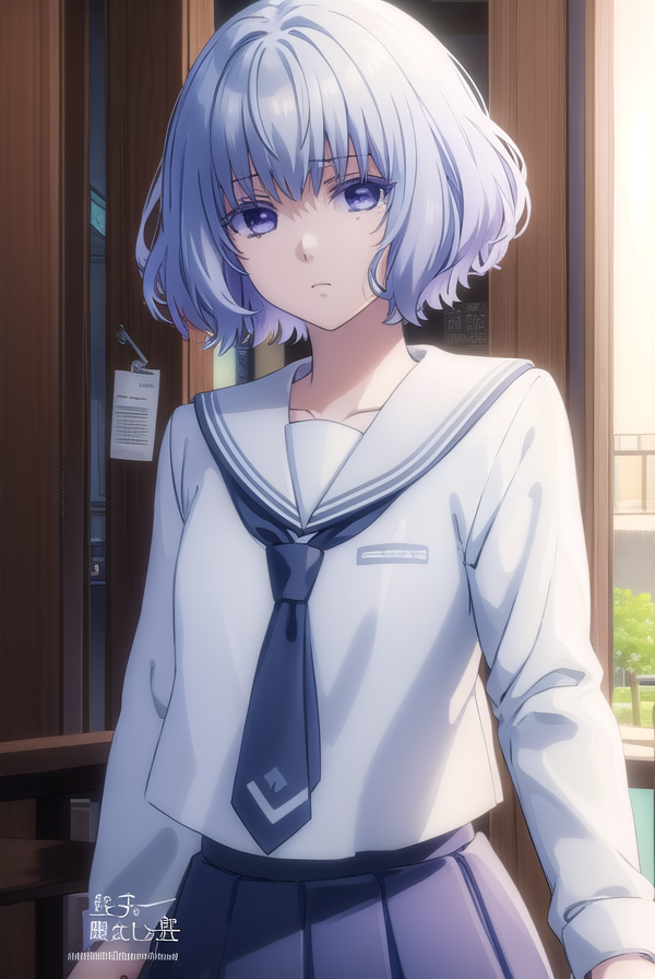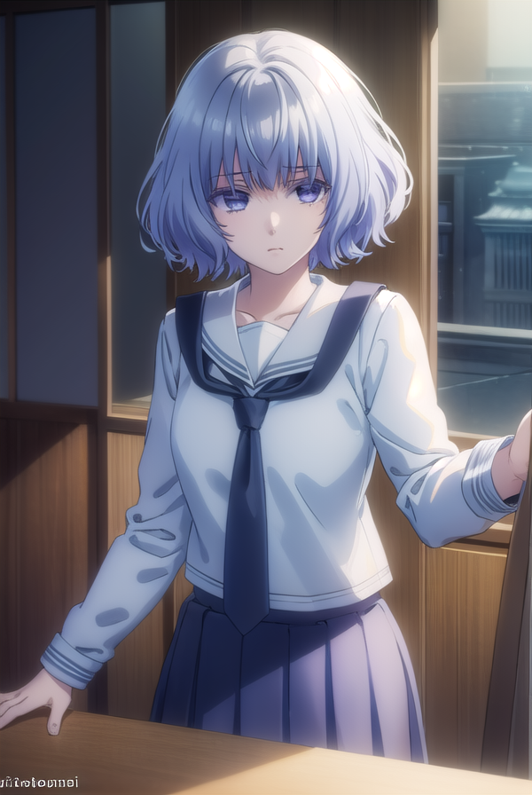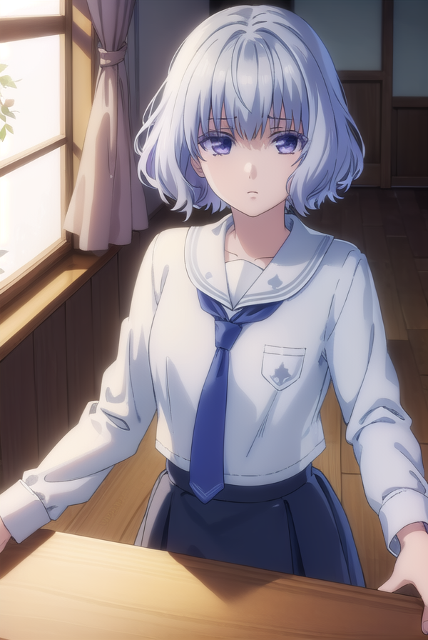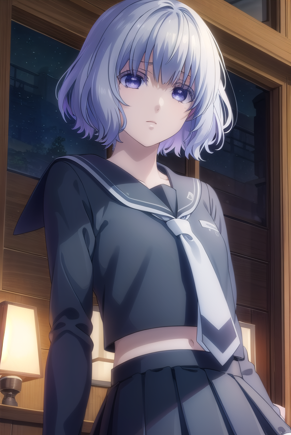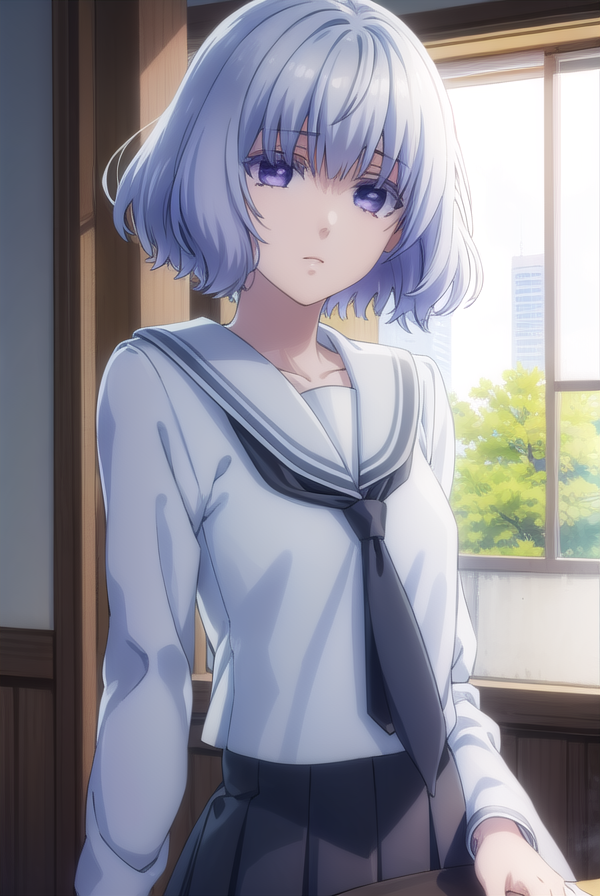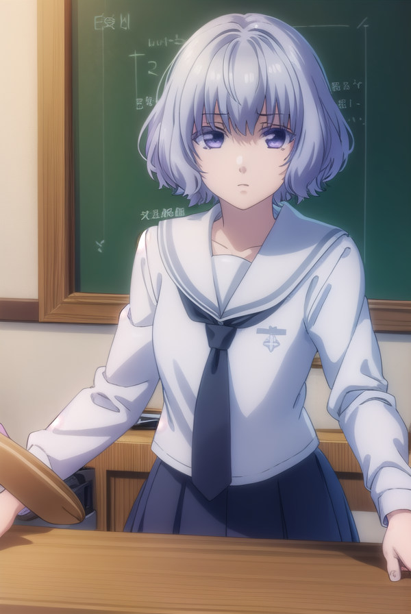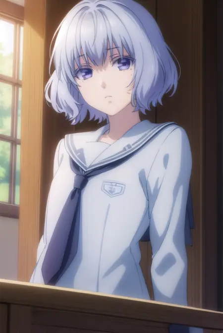 나나미 시라누이, 단발, 앞머리, (보라색 눈:1.1), 회색 머리, 두더지, 눈 밑 두더지,