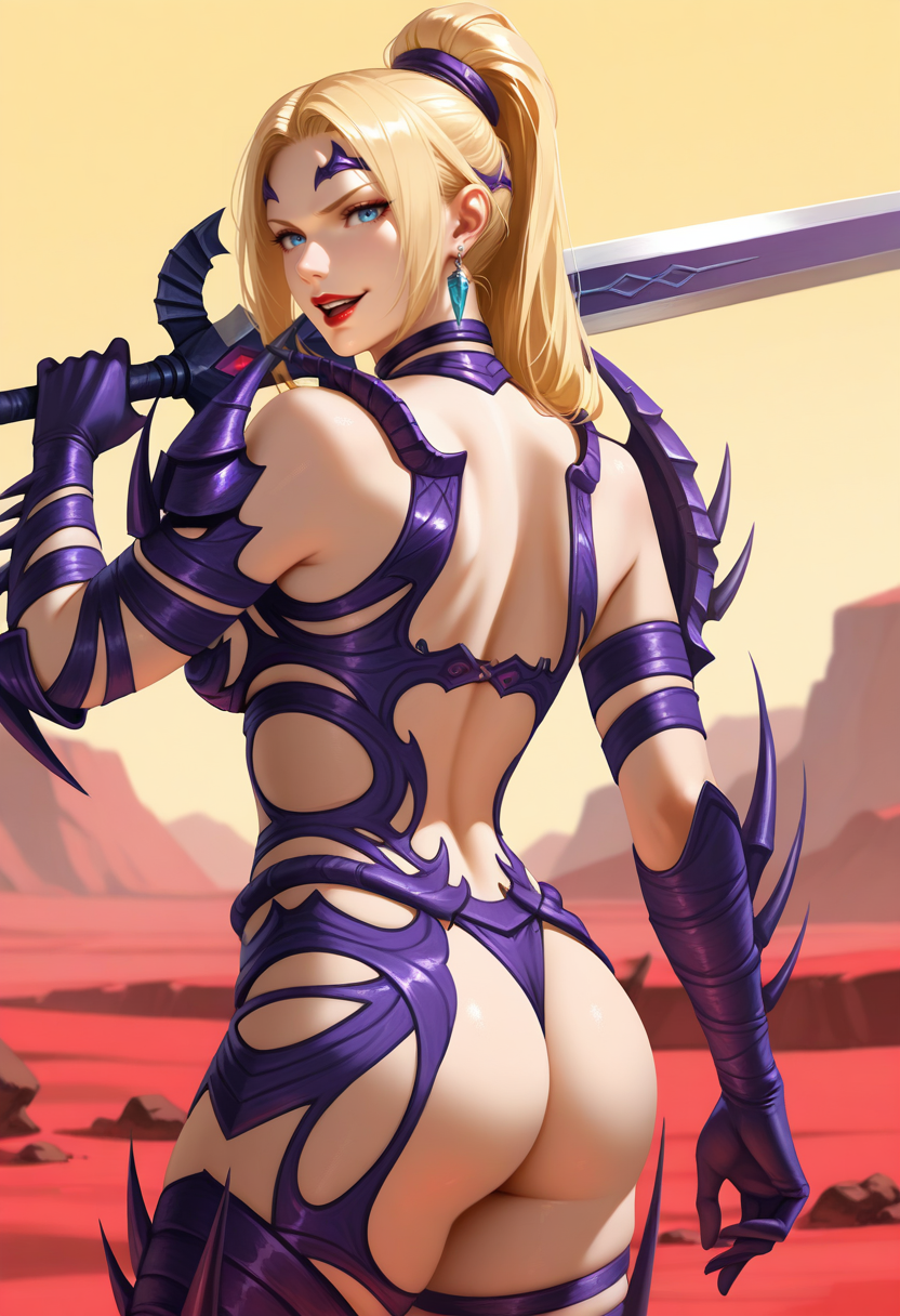 "RACHFI3ND, blonde hair, parted bangs,high ponytail, blue eyes, red lips,earrings, chest jewel, revealing clothes, purple armor, spikes, purple elbow gloves"
