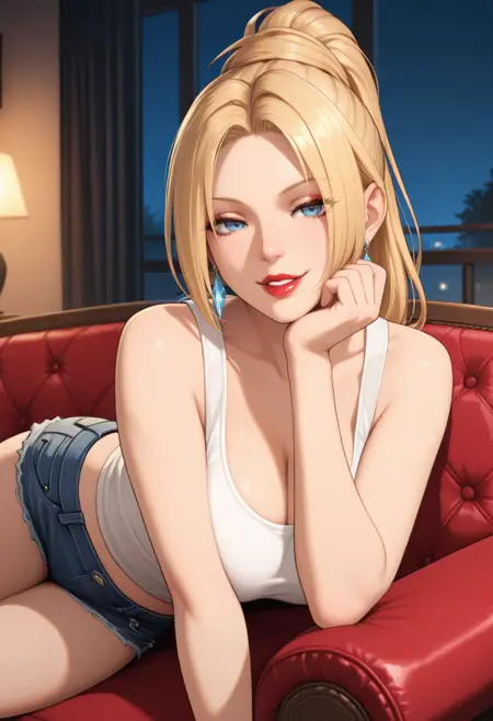 "DO4R4CH, blonde hair, parted bangs, high ponytail, blue eyes, red lips, diamond earrings, beehive hairdo, silver spiked circlet, black leotard, highleg leotard, red shoulder armor, cleavage cutout, navel cutout, detached sleeves, single black glove,black leather belt, single garther strap, thighboots"