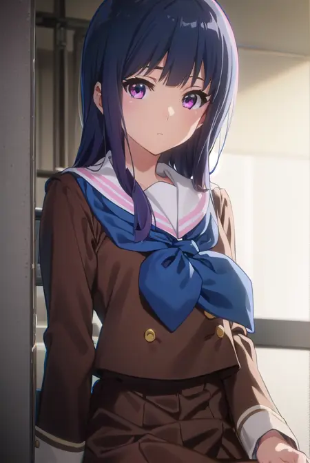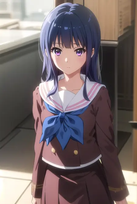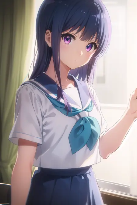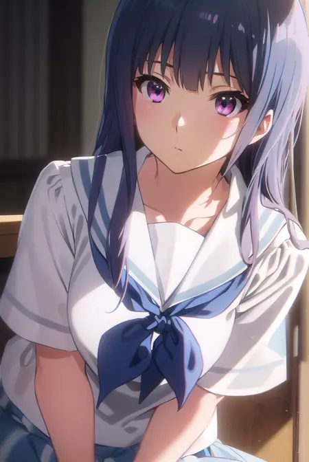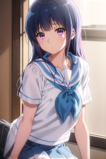 스커트, 셔츠, 학교 유니폼, 흰 셔츠, 단팔, 주름스커트, serafuku, 해군 칼라, 파란 스커트, 넥커치프, 파란 해군 칼라, 학교 가방, 파란 넥커치프, kitauji 고등학교 유니폼,