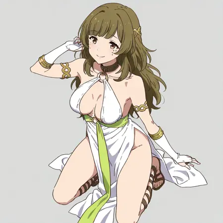 | 학습된 단어 | tsuya \(level 2 cheat isekai\), brown hair, long hair, bangs, brown eyes, mole under eye, hair ornaments, armbands, collar, o-ring, white dress, pelvic curtain, green sash, white fingerless gloves, heels, cleavage, large breasts, 1girl, solo복사됨! |