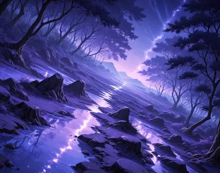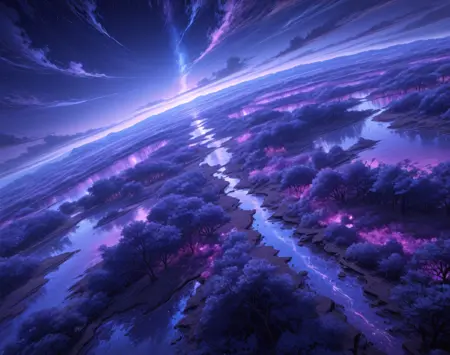 若在正向提示中加入(紫色、蓝色、粉色,闪烁表面,发光表面,暗色调画面,鲜艳色彩,靛蓝地面,蓝色树木),并在负向提示中加入(漂浮的头、头、草地、头骨、柱子),将有助于生成更理想的效果。我多次重制了这个LoRA,目前发布的版本是最佳结果——它不会过多呈现人物或漂浮岛屿,但不知为何常出现柱子和头颅,因此我建议使用上述负向提示。
