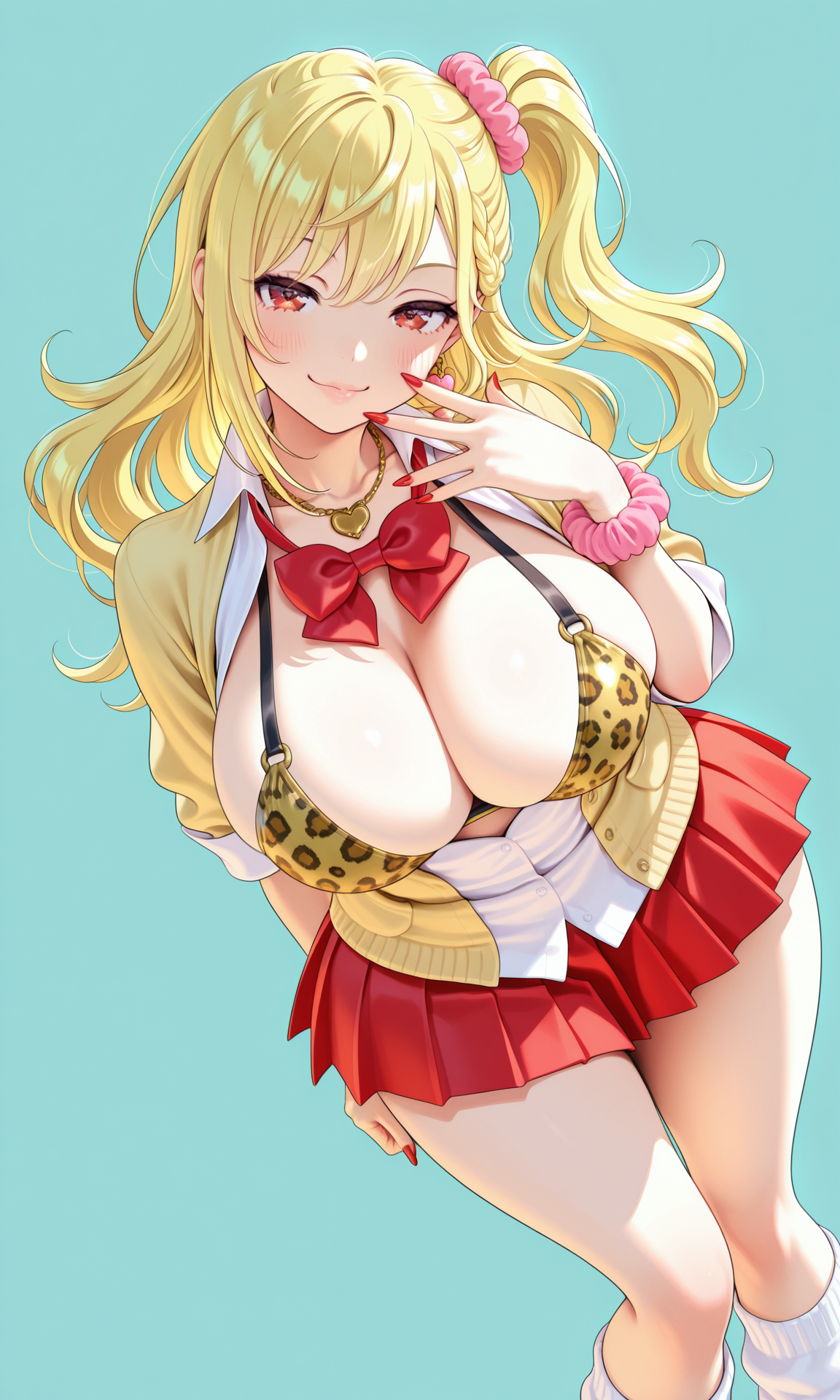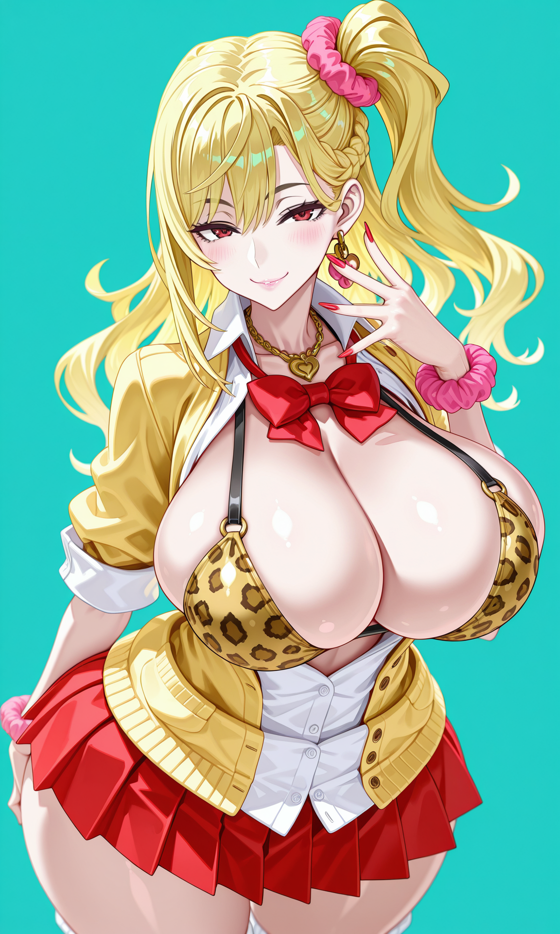 골드 목걸이, 빨간 활매듭, 가슴 선, 레오파드 프린트 비키니, 흰색 셔츠, 부분적으로 버튼 풀림, 칼라 셔츠, 노랑색 재킷, 열린 재킷, 짧은 소매, 싱글 손목 스러치, 빨간 손톱,