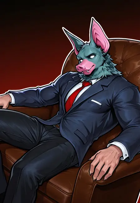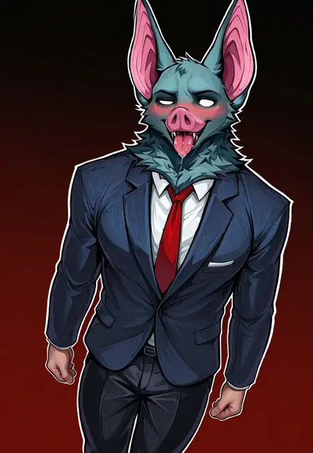 s0n4r, anthropomorphic bat, white eyes, pink snout, tall pointed ears, pink inner-ear, blue-gray fur, thick neck fur,