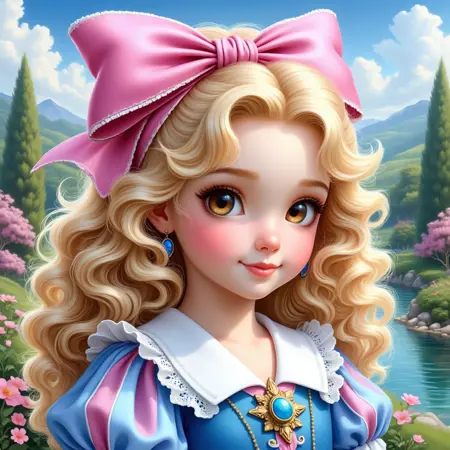 The girl has curly blonde hair and wears a pink headband with a prominent bow. She was dressed in a blue and white outfit with a delicate neckline. The background features a beautiful scenery of rivers, hills, and lush flowers and trees, with a fresh and elegant overall style that resembles a fairy tale princess, exuding a gentle and lovely charm.