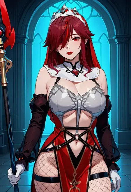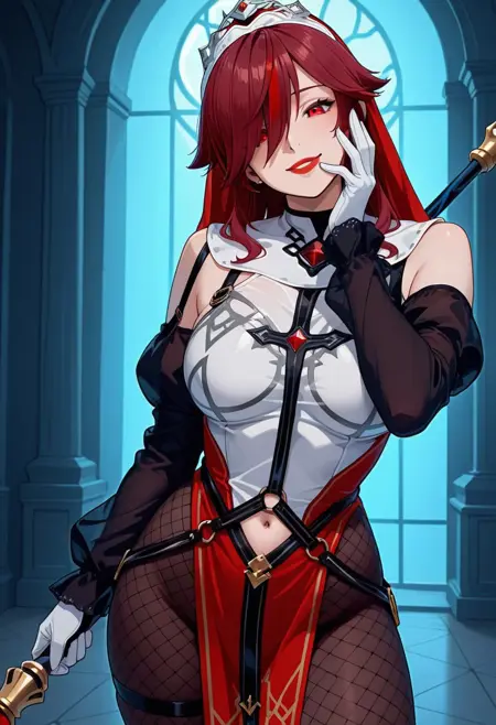 RosariaRegular, 1girl, solo, red hair, long hair, streaked hair, hair over one eye, red eyes, large breasts, red lips, lipstick, navel, wide hips, curvy, white elbow gloves, fishnet pantyhose, holding spear polearm, holding weapon, bare shoulders, nun habit, jewelry, ruby on chest, silver lines on dress, red and black pelvic curtain, golden lines on pelvic curtain, white dress, two-tone dress, detached sleeves, veil, multicolored headwear tiara, high heel boots,