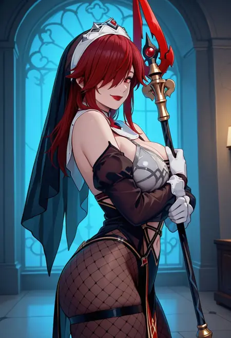 RosariaBondage, 1girl, solo, red hair, long hair, streaked hair, hair over one eye, red eyes, large breasts, red lips, lipstick, navel, wide hips, curvy, high heel boots, revealing clothes, nun habit, veil, black elbow gloves, see-through, black leather clothing, shiny black leather, detached transparent black sleeves, skindentation, shiny skin, smoothy skin, holding spear, thigh-high boots,