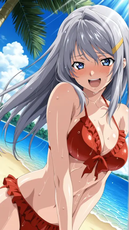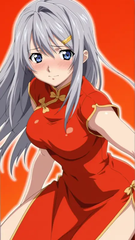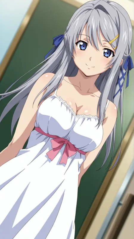 Outfit:white dress, hairclip, hair ornament, cleavage, hair ribbon, ribbon, pink bowtie,