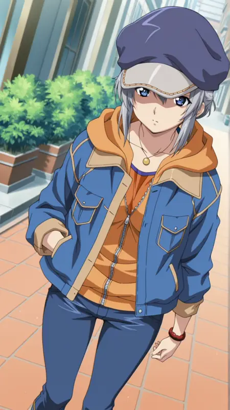 Outfit:jewelry, necklace, male focus,blue jacket, denim, zipper, orange shirt, cabbie hat, pants, hoodie, jeans, hat over one eye,