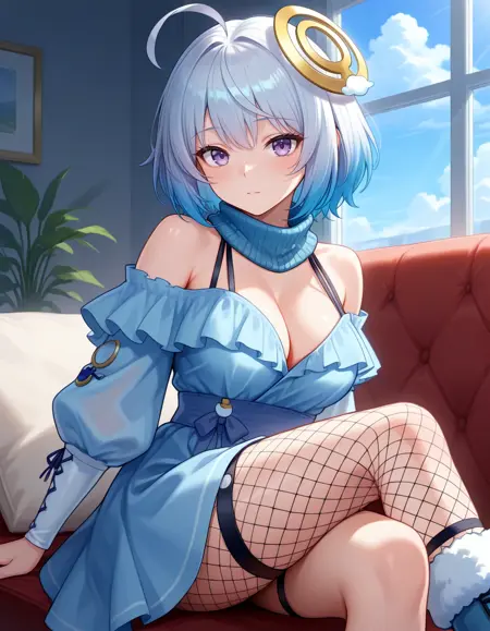 youbai,短发,银发,蓝色发梢,渐变发色,呆毛,紫色眼睛,光环,金色光环,发饰,云纹装饰,蓝色连衣裙,露肩,荷叶边,长袖,泡泡袖,罗纹高领,可拆卸领子,不对称腿部穿搭,渔网丝袜,单侧大腿绑带,过膝袜,蓝色靴子,毛边靴子,