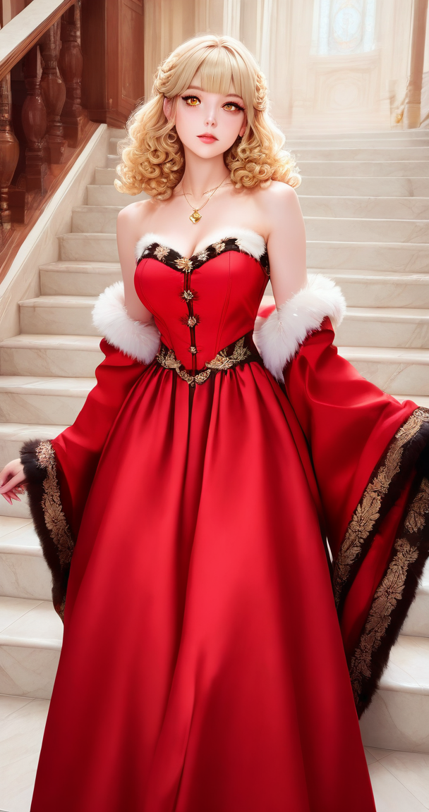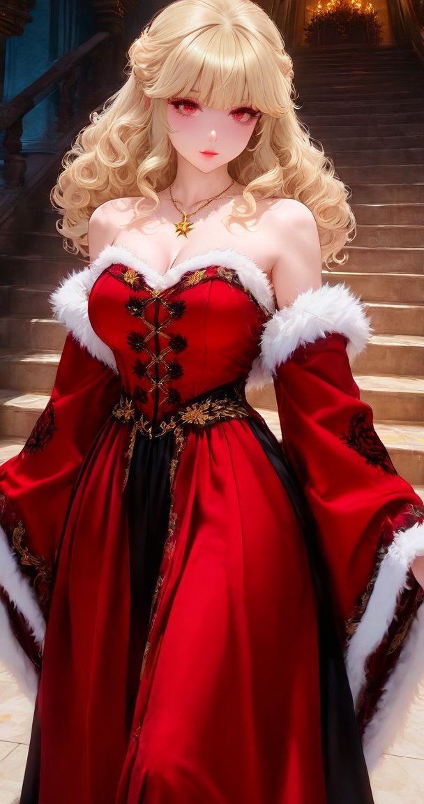 fur trim, bare shoulders, fur-trimmed sleeves, detached sleeves, wide sleeves, necklace, jewelry, red dress