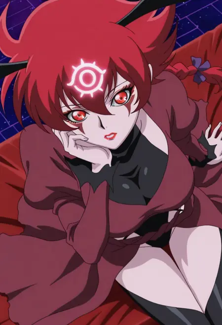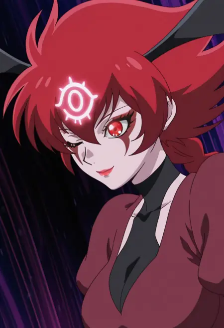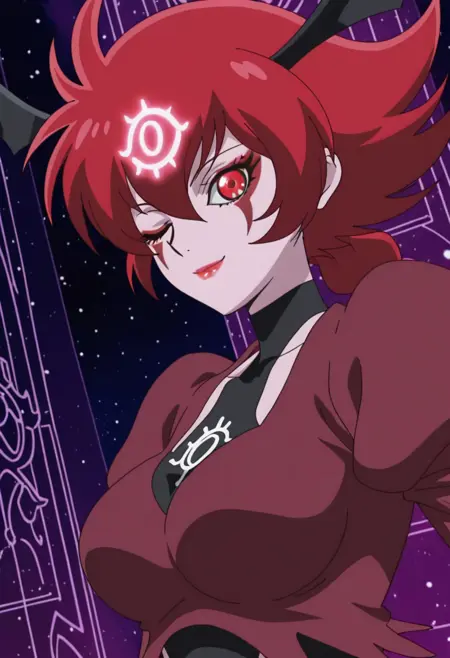 Fortune Lady Fire,colored skin,long hair,red hair,black bat-wing hair ornaments,single braid,glowing third-eye sigil on forehead,red eyes,facial mark,lipstick,makeup,leotard,long sleeves,puffy sleeves,thighhighs,thigh boots