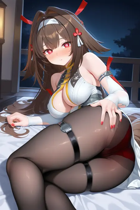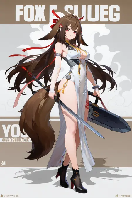 ye shunguang, 1girl, 긴 머리, 드레스, 빨간 눈, 갈색 머리, 매우 긴 머리, 동물 귀, 흰 드레스, 중국 복장, 중국 드레스, 꼬리, 골반 커튼, 소매 없음, 가슴 절개, 의상 절개, 머리띠, 어깨 노출, 검은 신발, 소매 없는 드레스, 머리카락 끌어올림, 머리 장식, 다리 문신
