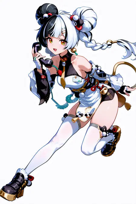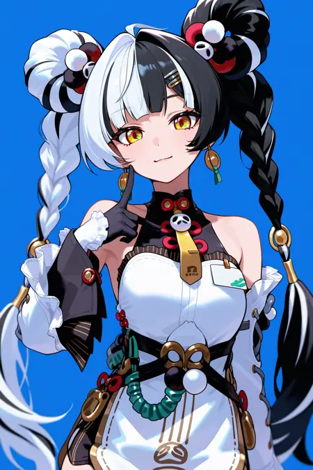 dialyn \(zenless zone zero\), 1girl, 黑发, 发饰, 分色发, 多色发, 耳环, 黄眼睛, 虚拟YouTuber, 辫子, 珠宝, 双辫, 分色发, 双色发, 长发, 长袖, 发夹, 荷叶边袖子, 双马尾, 分离袖子, 铃铛
