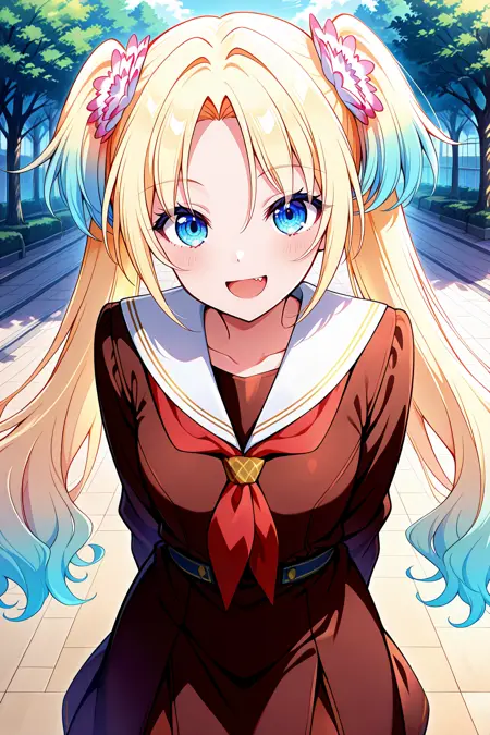 blonde hair, blue eyes, blue hair, curtained hair, gradient hair,