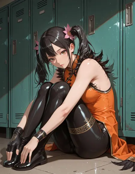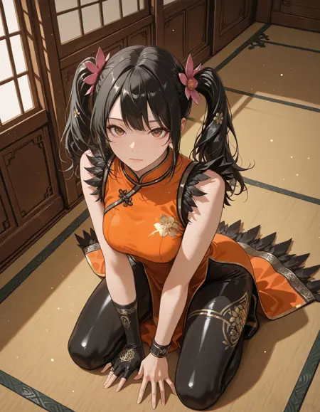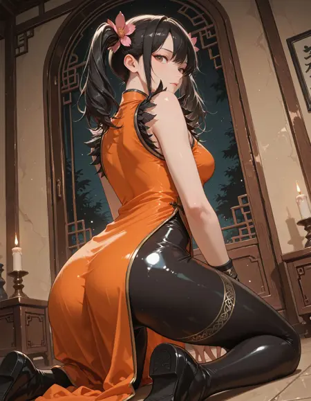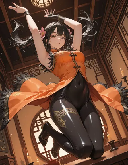 medium breasts, chinese clothes, orange dress, china dress, sleeveless dress, black bodysuit, feather trim, single glove, single fingerless glove, wristband