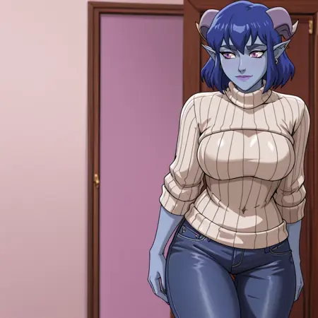 无包的触发词:JesterMNWithoutBag, 尖耳朵, 1girl, 无指手套, 有色皮肤, 角, 短斗篷, 蓝发, 黑色手套, 短发, 裙子, 胸部, 裤子, 口红, 紫色眼睛, 牛仔镜头