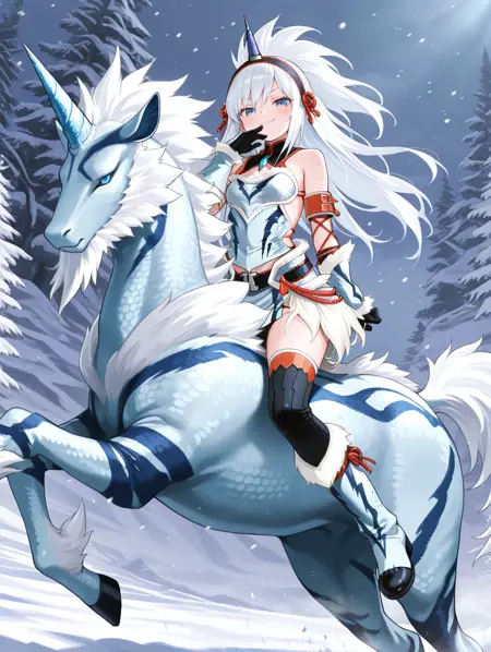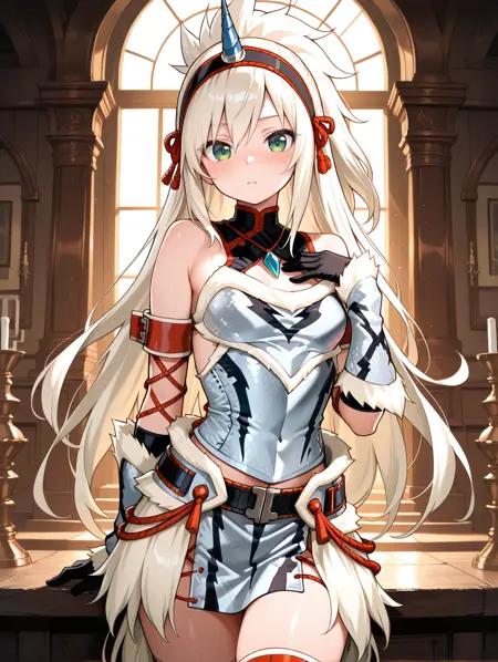 タグ(衣装):kirin xr armor, single horn hairband, pendant, black collar, white strapless halter, lace-trimmed gloves, white loincloth, black thighhighs, white knee boots
