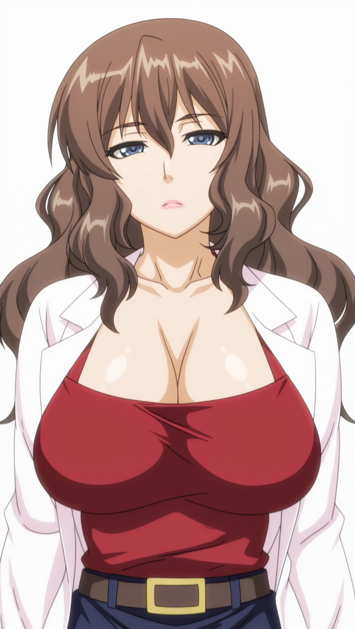 anime coloring, masterpiece, best quality, amazing quality, mizushirohazuki, 1girl, long hair, wavy hair, brown hair, blue eyes, big breasts, labcoat, tank top, red tank top, cleavage, belt, skirt, blue skirt, thighhighs, white thighhighs, solo, pose, standing, looking at viewer, from front, ((((white background, simple background))))