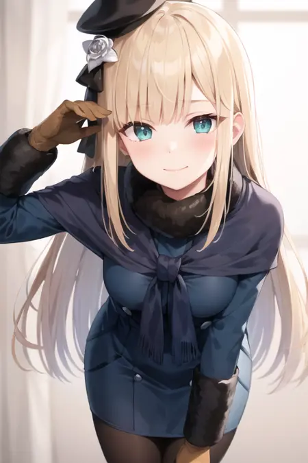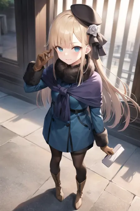 Recommeneded prompts: hat, long sleeves, scarf, gloves, jacket, headwear, looking at viewer, hair flower, brown boots, fur collar, fur trim, black pantyhose
