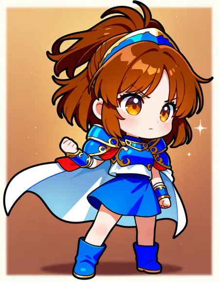 권장 프롬프트: 갈색 머리카락, 앞머리, 머리 뒤로 묶기, 갈색 눈, 왕관, 어깨 보호대, 팔찌, 파란 치마, 흰색 망토, 파란 부츠,