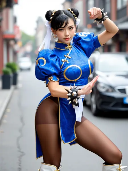 トリガー:chunli blue outfit, fluxchunli, jewelry, solo, spikes, pantyhose, hair bun, double bun, bracelet, ass, spiked bracelet, pelvic curtain, bun cover, boots, black hair, sash, earrings, brown eyes, puffy short sleeves, puffy sleeves, knee boots, short sleeves, looking back, white footwear, standing, brown pantyhose, from behind, lips, blurry background, photo background, blurry, thighs, short hair