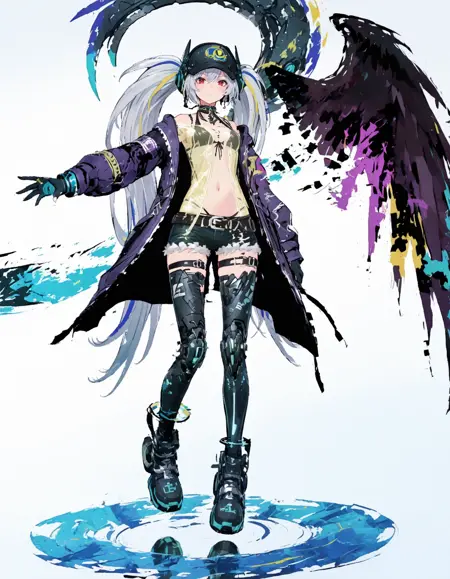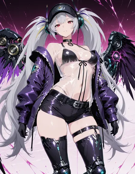 mai_pgrlunatyfz,very_long_hair,twintails,grey_hair,multicolored_hair,red_eyes,hat,navel,jacket,open_clothes,single_wing,mechanical_wings,multicolored_wing,purple_jacket,see-through_shirt,black_bikini,belt,short_shorts,thigh_strap,single_mechanical_arm,choker,open_jacket,headphones,single_thighhigh,skates
