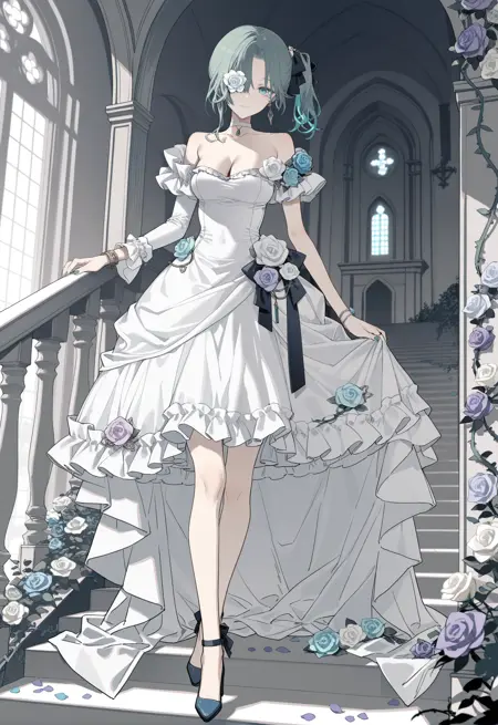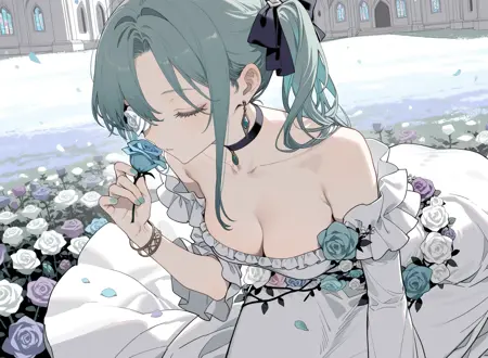 Use these tags to trigger:saya etude,aqua hair,green hair,bangs,centre parting bangs,messy hair,side ponytail,hair ornament,hair bow,blue hair bow,one-eyed,flower over eye,flower on eye,green eyes,aqua eyes,white flower,white rose,flower,earrings,jewelry,collarbone,choker,white choker,off shoulder,bare shoulders,medium breasts,cleavage,single sleeve,bracelet,nail polish,blue flower,dress,strapless dress,white dress,frilled dress,puffy dress,frills,blue rose,purple rose,high heels,blue footwear,strapless,