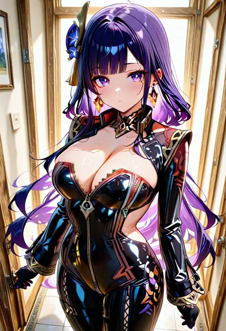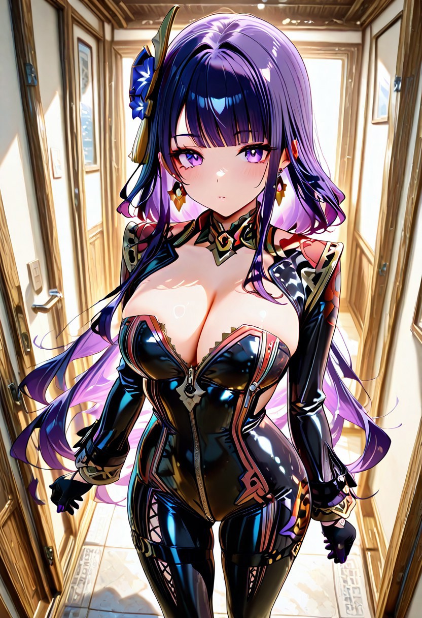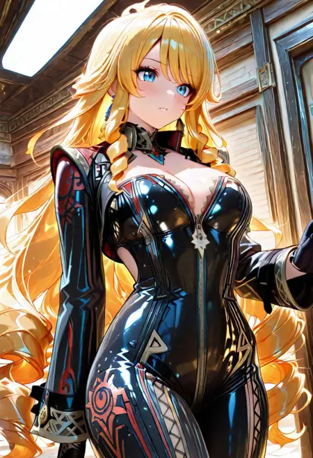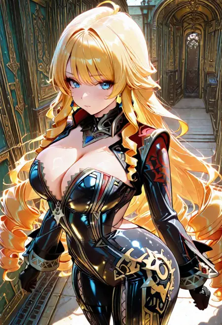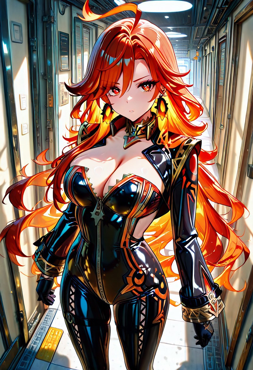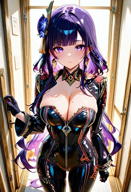 MavClS,black bodysuit,earrings, choker, zipper,cleavage,strapless suit,clothing cutout, black gloves, long sleeves