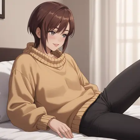 AoiSweater, 스웨터, 긴 소매, 노란색 스웨터, 클라비컬, 리브 스웨터, 바지, 터틀넥, 검은 바지,