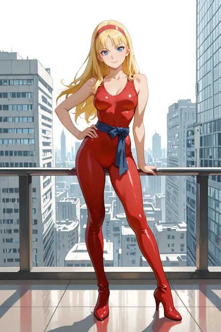 トリガー(カジュアル):AprilEag、ロングヘア、ブロンドヘア、青い目、赤いヘアバンド、ノースリーブボディスーツ、赤いボディスーツ、鎖骨、裸の腕、濃い青いサッシュ、赤い靴下、赤いハイヒール