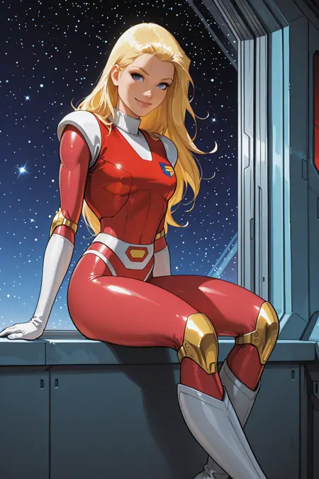 トリガー:AprilEag、ロングヘア、ブロンドヘア、青い目、赤いヘアバンド、白いタートルネック、赤いパワーアーマー、ゴールドのエルボパッド、白い手袋、ゴールドの膝ガード、白いブーツ