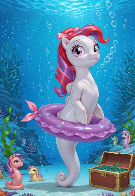 生成G1《我的小马驹》海洋小马,包括成年和幼崽,可带或不带游泳浮圈。训练数据来自包装盒艺术和照片。