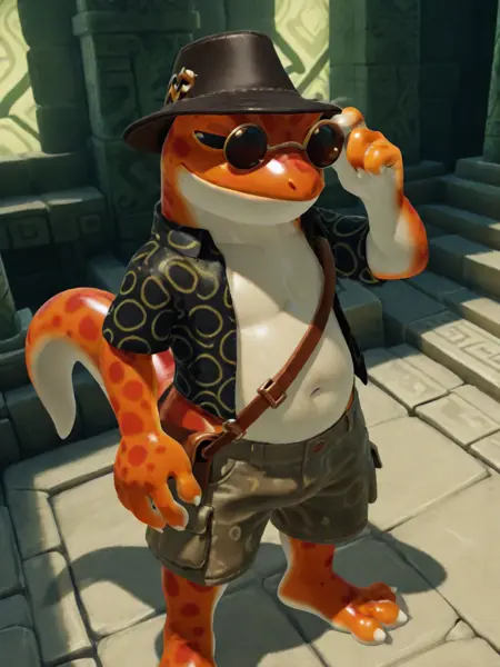 训练关键词: 蝾螈、带斑点的橙色皮肤、黑色空洞双眼、白色反阴影、蝾螈尾巴、蝾螈软呢帽、敞开的黄色圆圈图案黑色衬衫、圆形太阳镜