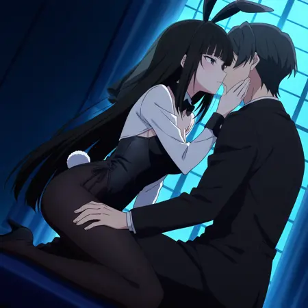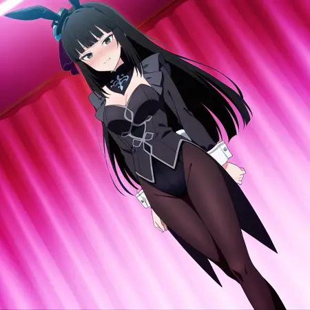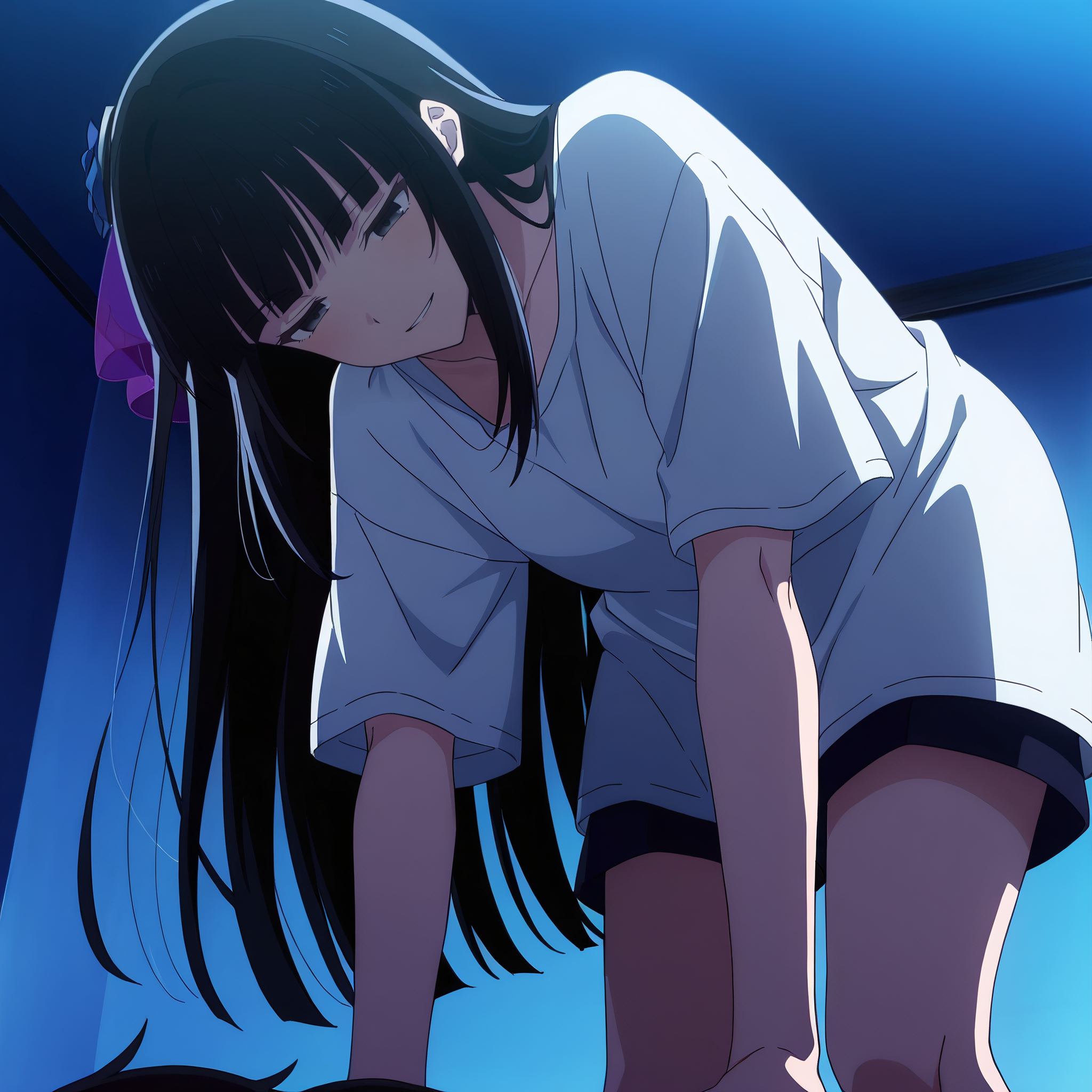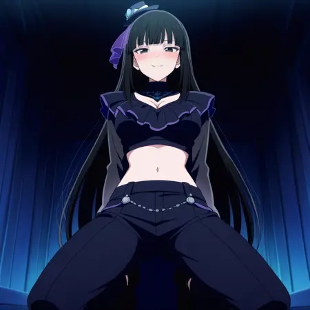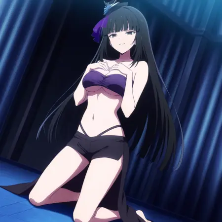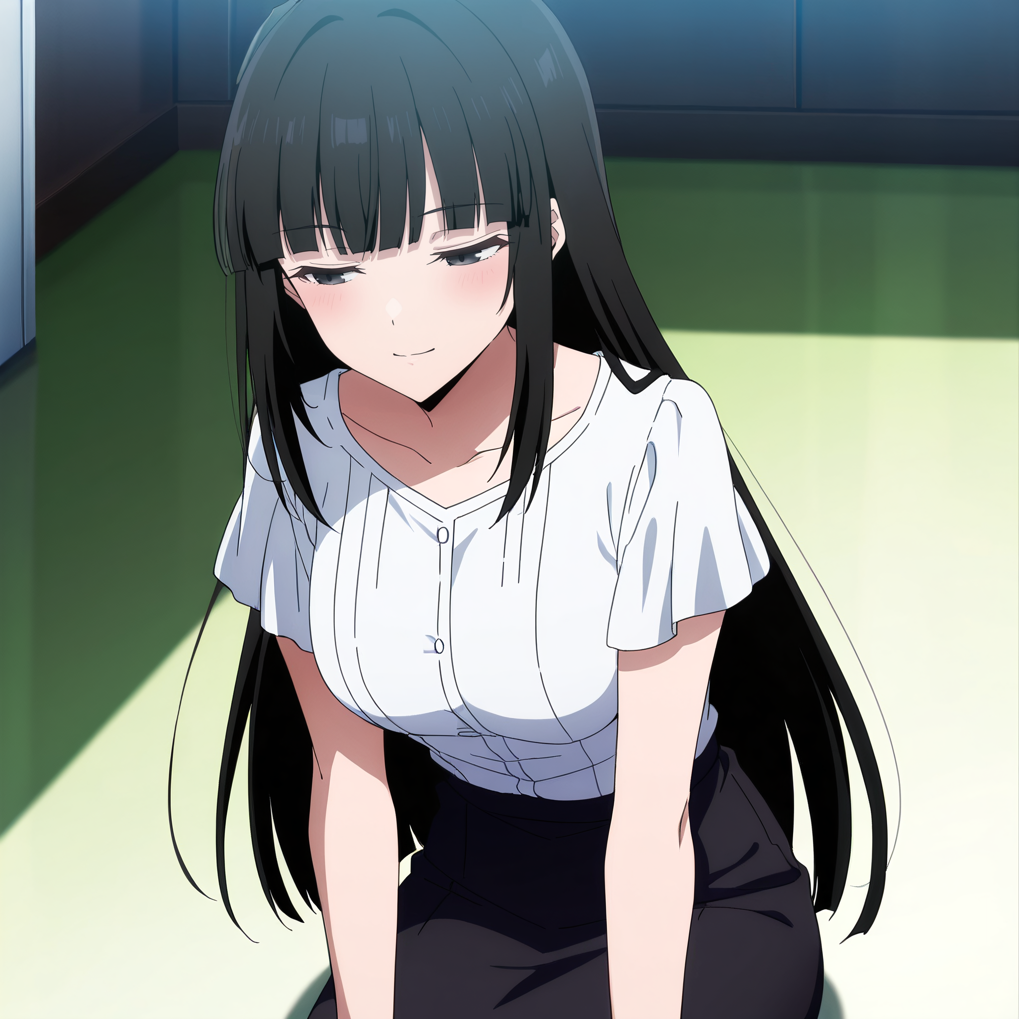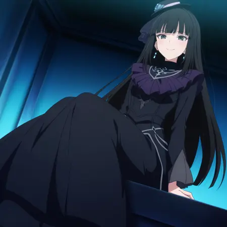 AMGEldora, long hair, black hair, bangs, blunt bangs, black eyes, eyebrows visible through hair,