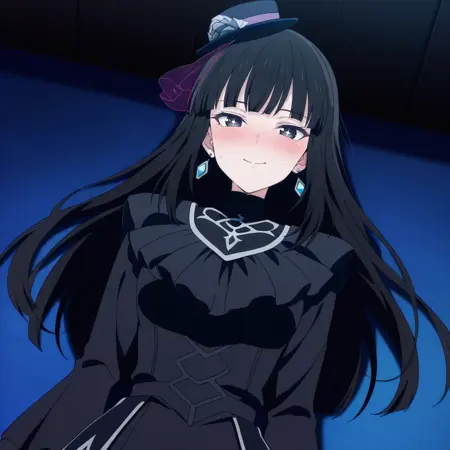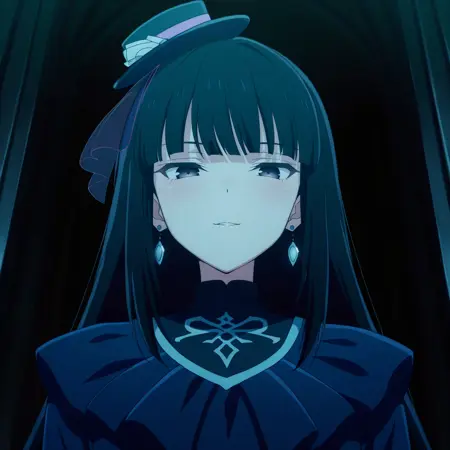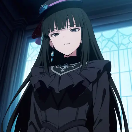 hat, black headwear, dress, bow, long sleeves, earrings, jewelry, ribbon, hair bow, black dress,