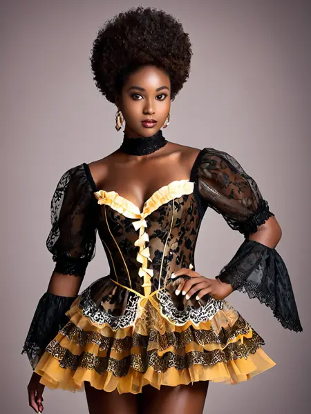 Creates layered Victorian silhouettes with corsets, petticoats, and capes
